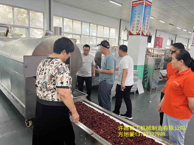 2023年7月21日,河南知名调味品品牌李大厨带200斤辣椒来厂试机许昌智工四米电磁流水线进行炒制。